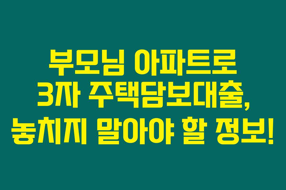제가 직접 알아본 바로는, 부모님의 가족 명의 아파트를 담보로 3자 주택담보대출을 계획하는 분들에게 유익한 정보를 정리해 보았습니다. 3자 주택담보대출이라는 개념은 타인의 명의로 된 주택을 담보로 자금을 이용하는 방식인데요. 이를 통해 자녀가 부모님 아파트를 활용하여 금융적 지원을 받을 수 있는 방법을 소개합니다. 아래를 읽어보시면 이 대출의 조건과 유의사항에 대해 자세히 알 수 있을 것입니다.
