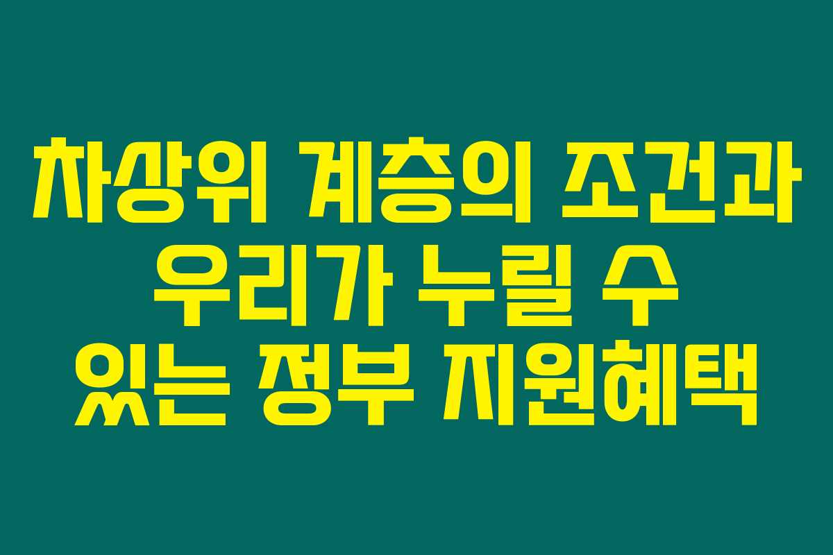 제가 직접 체크해본 바로는, 차상위 계층에 해당하는 가구는 소득수준이 매우 낮아 국가의 도움이 절실합니다. 이렇게 경제적으로 어려운 상황에 처해 있는 사람들이 다양한 도움이 필요하다는 점에 주목하여 차상위 계층의 조건과 정부 지원사업에 대해 자세히 알아보았습니다. 아래를 읽어보시면, 자신의 상황에 맞는 지원을 받을 수 있는 방법을 확인할 수 있습니다.
