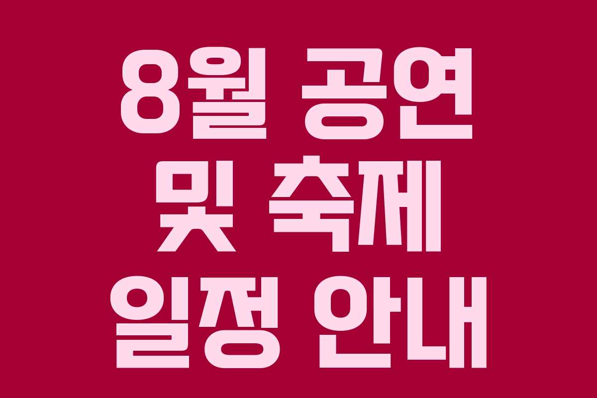 이번 8월은 여러분의 문화 생활을 더욱 풍성하게 해줄 다양한 공연과 축제로 가득 차 있습니다. 각종 이벤트에 많은 참여 부탁드립니다!