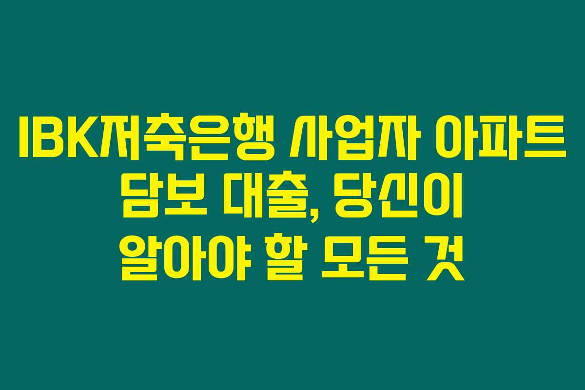 제가 알아본 바로는 IBK저축은행의 사업자 아파트 담보 대출이 많은 개인사업자에게 유용한 금융상품으로 자리 잡고 있어요. 이 대출은 소유하고 있는 아파트를 담보로 하여 사업 운영이나 생활안정자금을 지원받을 수 있는 가능성을 제공합니다. 아래를 읽어보시면 이 상품의 주요 조건과 혜택, 신청 절차에 대해 자세히 알 수 있을 것입니다.